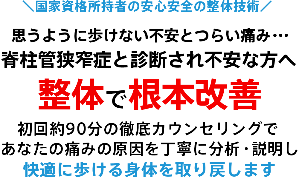 あなたの脊柱管狭窄症の原因は、長年の生活習慣や体の使い方のクセから生まれたもの。だからこそ、一時的に痛みを和らげるのではなく、「痛みの原因そのものにアプローチする必要がある」のです。