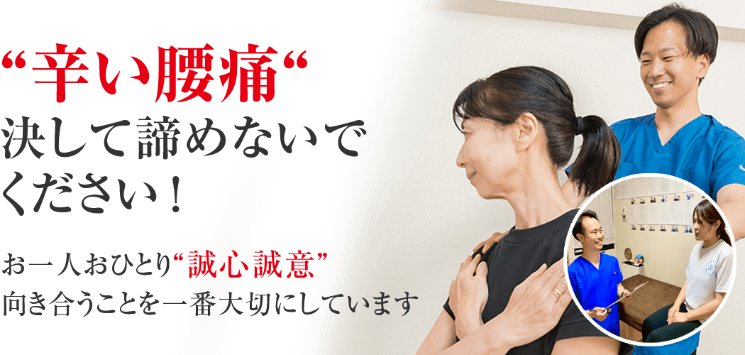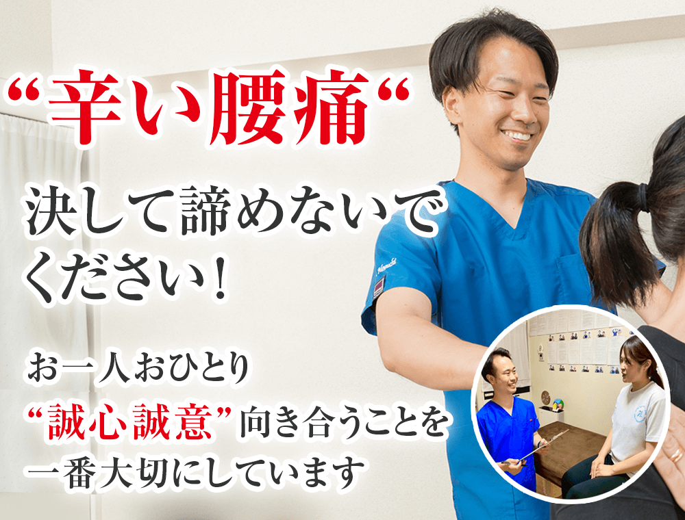 私は誰よりもあなたと向き合います。あなたのお悩みを私に聞かせてください。あなたの腰痛を改善する為に全力で施術致します。本気で腰痛を改善したいと思われる方は今すぐお電話ください!