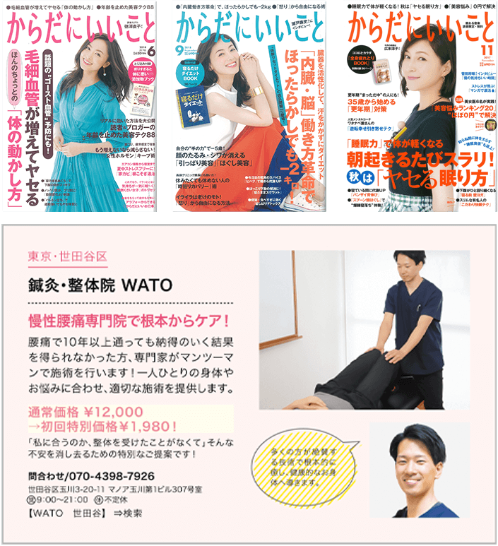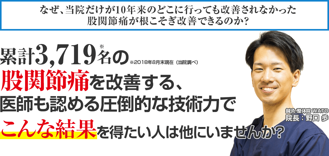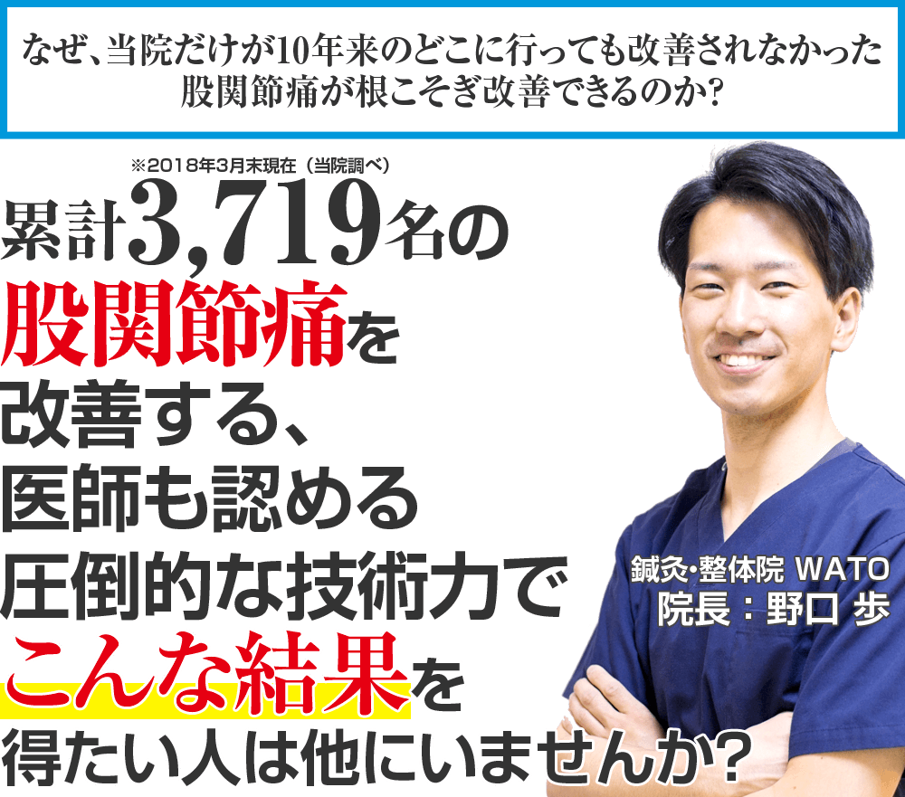 身体のプロとしての証である国家資格を持ち、世界基準の技術、数多くの股関節痛の患者様から支持され、あなたの症状に真正面から向き合ってくれる二子玉川で唯一の股関節痛専門 鍼灸・整体院 WATOに来院し、もう二度とその痛みに我慢することのない人生を手に入れる道。