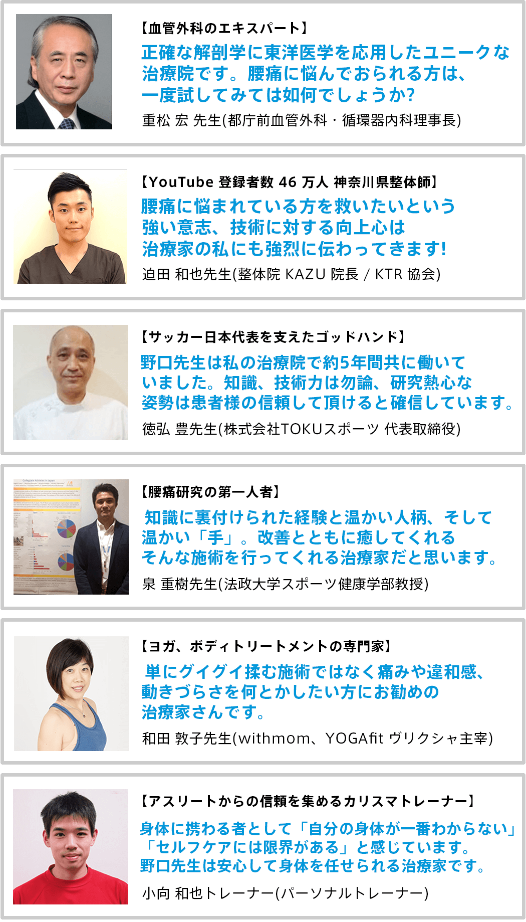 今回ばかりは手術しかない!?と諦めの気持ちもありましたが、野口先生は「手術はしないでも大丈夫だと思います」と言って下さいました。色々な原因での痛みがあると思いますが、本当に真剣に向き合って先ずは話をよく聞いて下さる頼れる先生です。心から施術を受けて良かったと思っています。